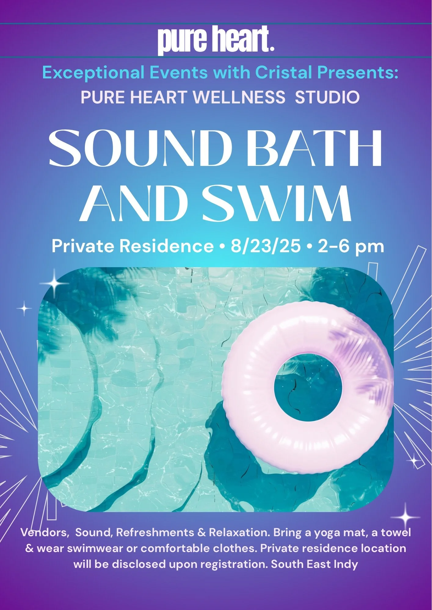 We’re now accepting vendor inquiries for Sound Bath + Swim — a curated Pure Heart Wellness Studio experience, presented by Exceptional Events with Cristal.